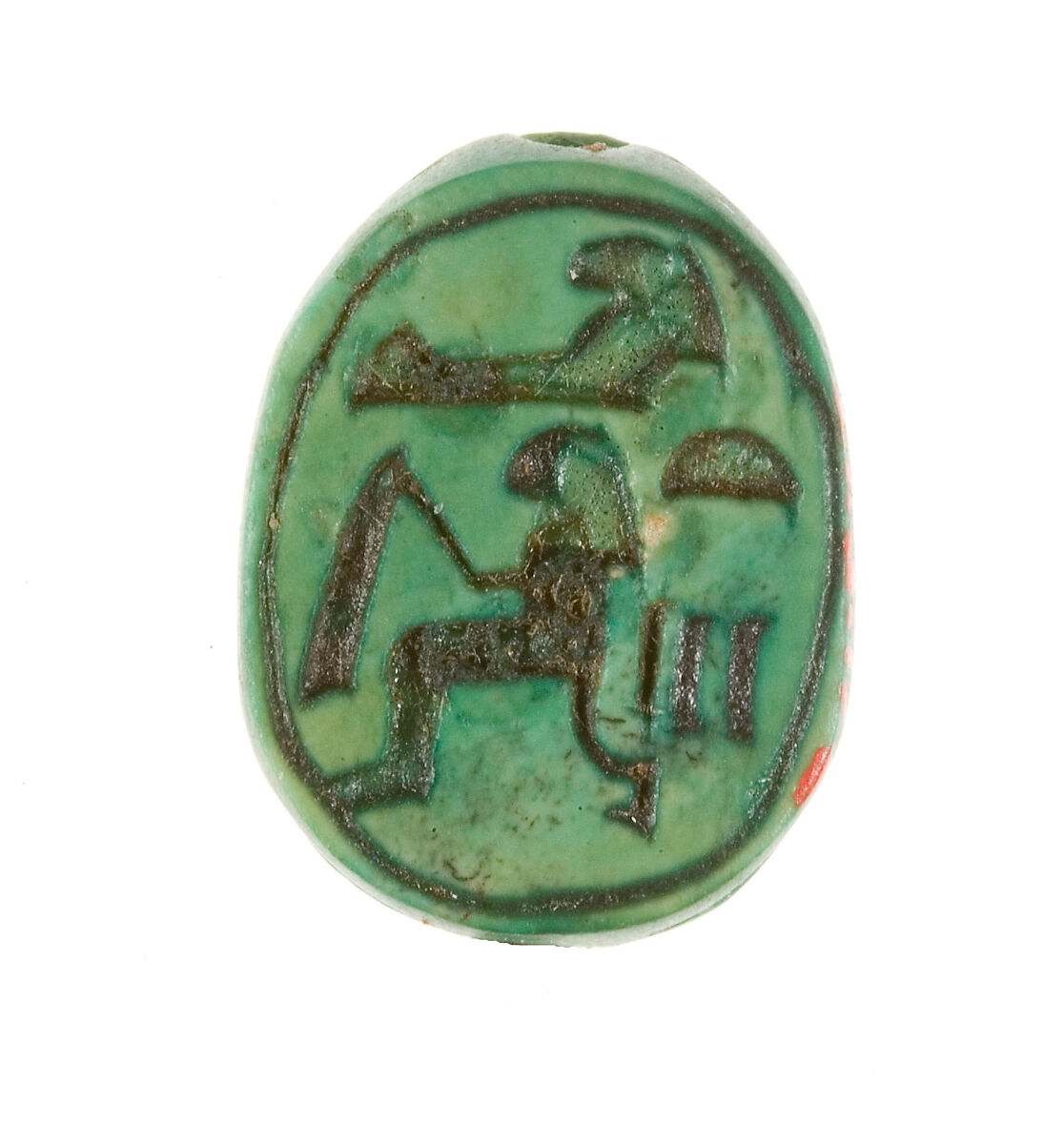 This scarab was found in one of the foundation deposits placed along the front wall of the lower court of Hatshepsut's funerary temple at Deir el-Bahri. The inscription on the base records Hatshepsut's personal name (Hatshepsut), which means "foremost of noblewomen." Two other scarabs from the same foundation deposit have similar versions of the same inscription, though the style is not exactly the same (27.3.168, 27.3.169). The backs of the scarabs are also similar.
