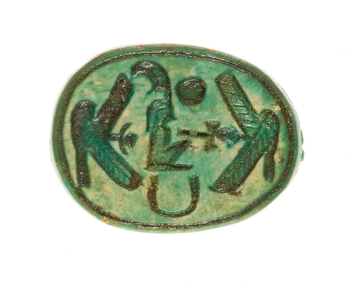 The inscription on the base of this scarab records Hatshepsut's throne name, Maatkare, enclosed in a cartouche and flanked by two falcons with outstretched wings. The bird on the right proffers an ankh hieroglyph (life), and the bird on the left probably holds a shen hieroglyph (eternity, protection). The name Maatkare may be roughly translated as Maat (the goddess of truth) is the life force of Re (the sun god).