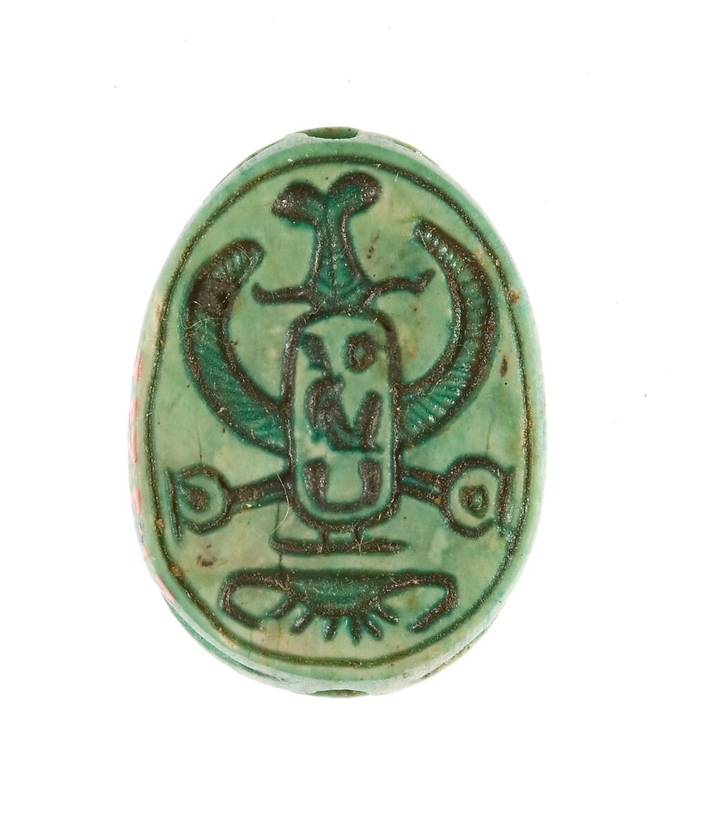 The inscription on the base of this scarab records Hatshepsut's throne name, Maatkare, enclosed in a cartouche embellished with the wings and legs of a bird, and topped with the feathers and horns of the divine atef-crown. the bird talons cluch shen hieroglyphs (eternity, protection). Beneath the cartouche is the hieroglyph representing gold. The name Maatkare may be roughly translated as Maat (the goddess of truth) is the life force of Re (the sun god).