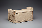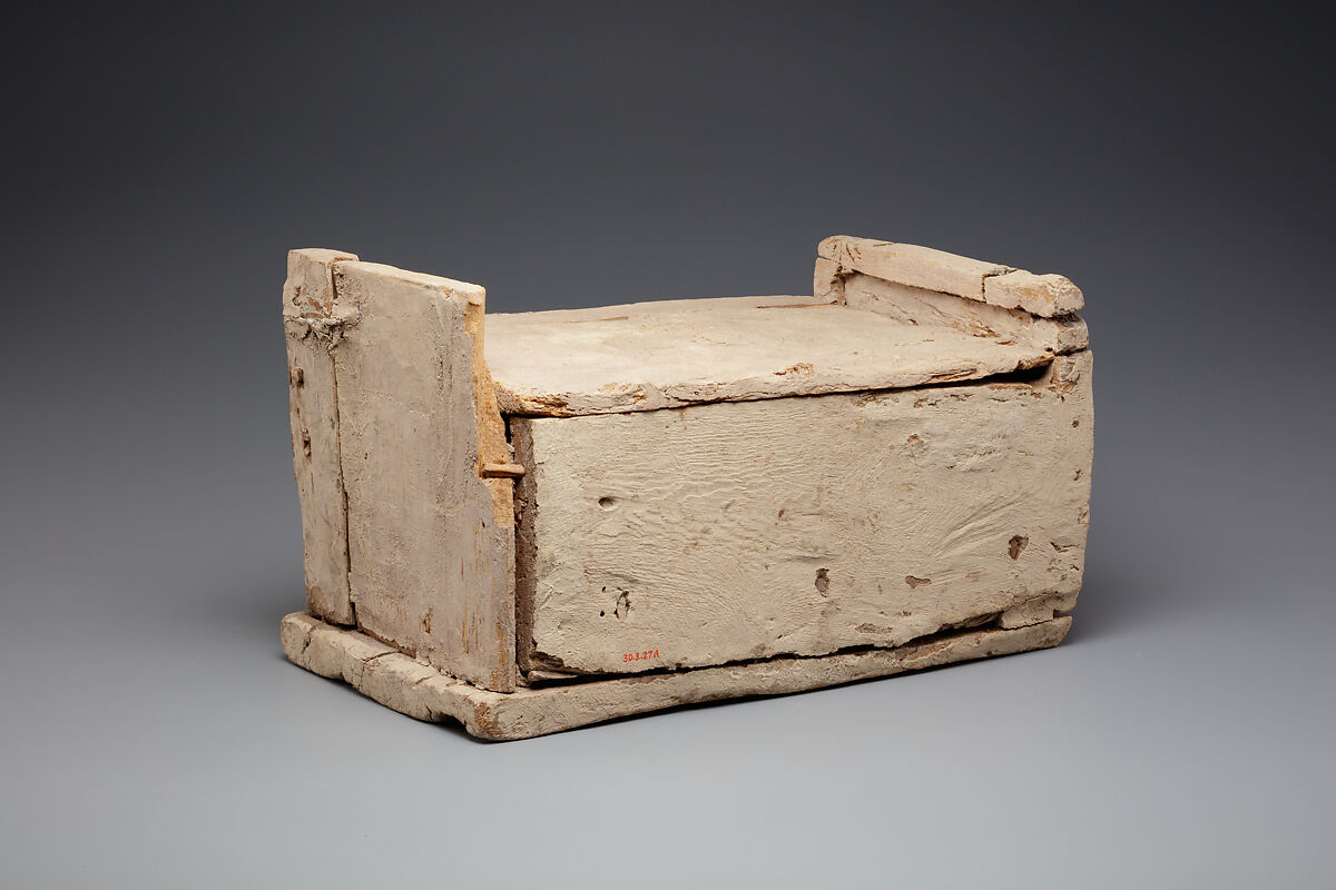 Seven shabti boxes were interred with Nauny; five came to New York in the division of finds (30.3.26–.30) and two are now in the Egyptian Museum, Cairo. All are made of sycomore wood and have high ends and flat lids that were meant to slide into grooves, although only one box (Cairo JE 55044) actually had these made. A white stucco wash was applied after the lids were closed. A total of 392 faience shabtis were divided between the boxes, in most cases packed tightly in an upright position. They are of two types: foremen and workers, with an average ratio of one foreman to ten workers. This box contained 5 supervisors and 63 workers.