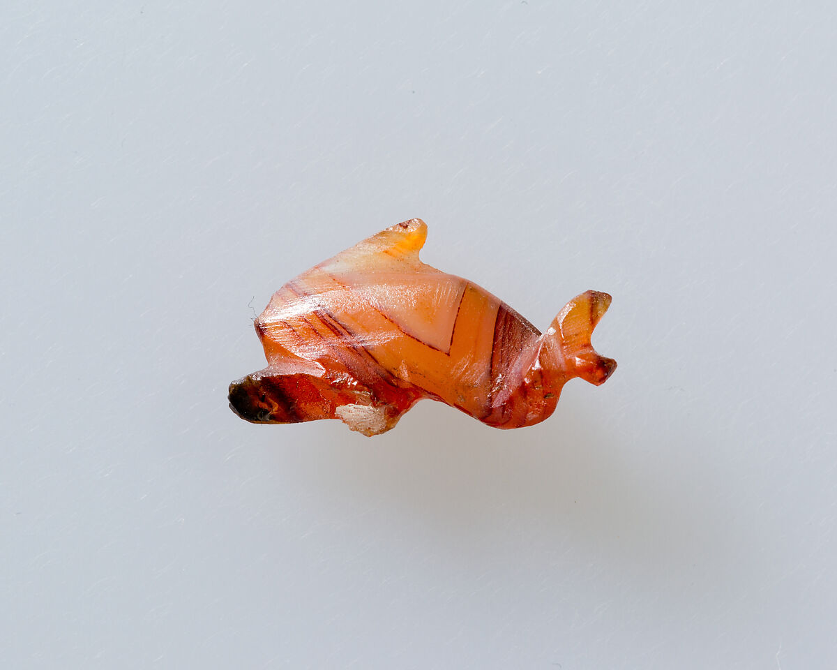 This is one of a small group of animals carved in semiprecious stones from the Davis Collection that share share a general liveliness and more Hellenistic than Egyptian style. Alongside subjects that are familiar in Egyptian iconography such as a baboon and ducks, are others like a goat, dolphins, rhinoceros, galloping horse, and reclining hound that are more at home in the Greco-Roman sphere.