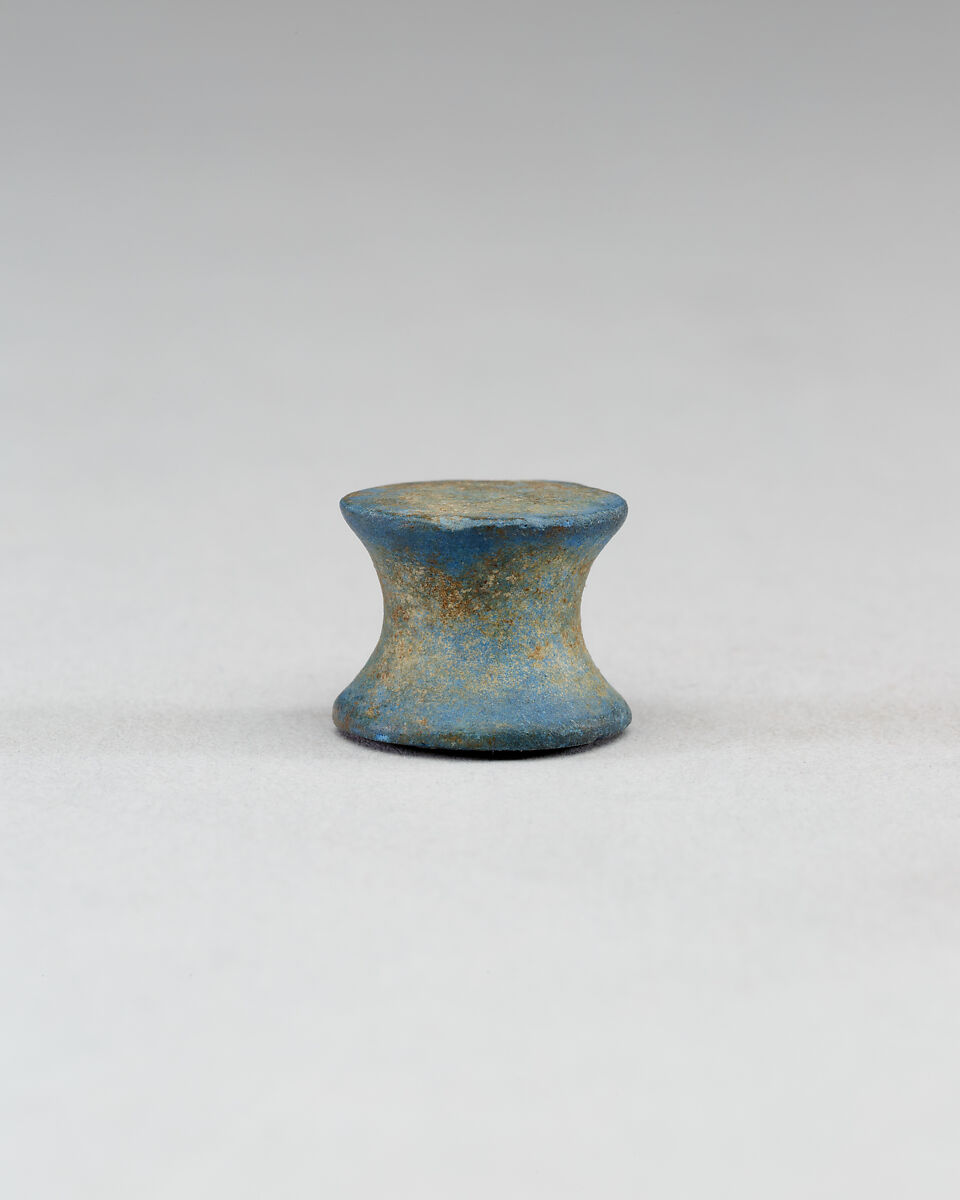 The first room that the Museum's excavators cleared in the family tomb of Neferkhawet was the east chamber. In the northwest corner of this room they found a mis-matched partial set of gaming pieces. The two types, conical and spool-shaped, are common components of the board games senet and 20-squares which were usually combined in a single game box with the game boards on opposite sides, and a drawer for the gaming pieces and the throw sticks or knuckle bones that were used like dice to determine how the pieces were moved on the boards. The eight gaming pieces, five conical and three spool-shaped, were lying on their sides next to the outlined remains of an insect-eaten game box.
