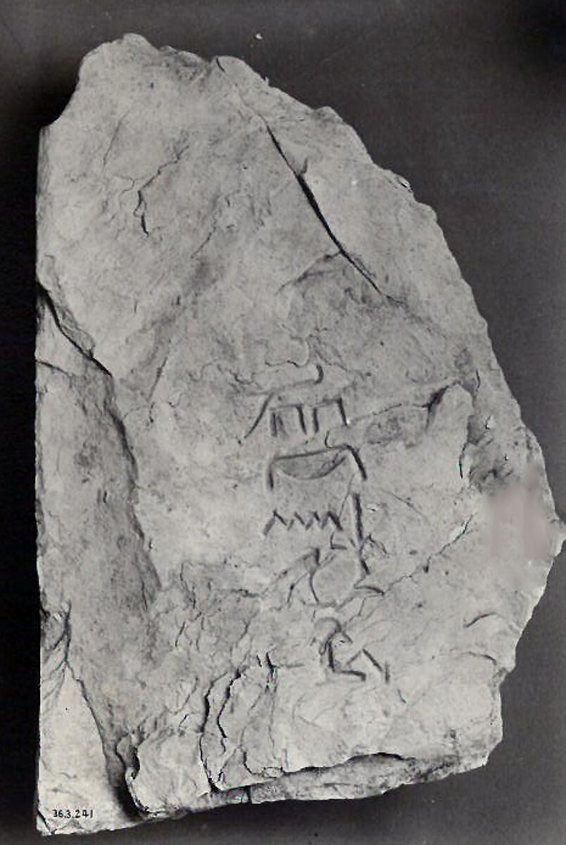 A group of large, rough limestone chips in the collection have been inscribed witht the name and some of the titles of Hatshepsut's official Senenmut. These name stones (also called tally stones) were originally built into the terrace retaining walls and facade revetments of Senenmut's tomb chapel (TT 71). The stones were not intended to be seen in the finished structure, rather, they may have been included to symbolize Senenmut's ownership of the monument. Over time, the terrace and revetments collapsed, and the stones were scattered over the hillside below the tomb chapel where they were uncovered by the Museum's Egyptian Expedition during the 1935-1936 field season. Those in New York were received by the Museum in the division of finds.