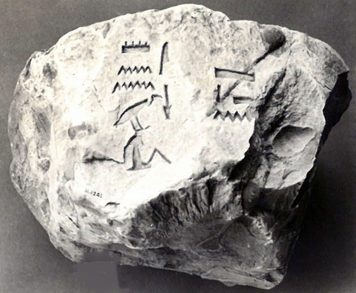 A group of large, rough limestone chips in the collection have been inscribed witht the name and some of the titles of Hatshepsut's official Senenmut. These name stones (also called tally stones) were originally built into the terrace retaining walls and facade revetments of Senenmut's tomb chapel (TT 71). The stones were not intended to be seen in the finished structure, rather, they may have been included to symbolize Senenmut's ownership of the monument. Over time, the terrace and revetments collapsed, and the stones were scattered over the hillside below the tomb chapel where they were uncovered by the Museum's Egyptian Expedition during the 1935-1936 field season. Those in New York were received by the Museum in the division of finds.