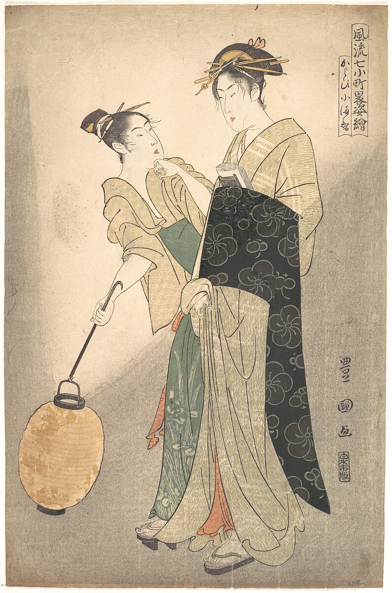 This print is a parody of the popular story. A courtesan is on her way home from visiting her favorite customer, knowing that their meetings will eventually end. Both Fukakusa Shōjō, in the Noh play, and the courtesan in this print share a profound sense of promise unfulfilled. Here, the mistiness of the night (achieved by means of an ink spray) and the woman's disheveled hair are suggestive of their romantic lingering.