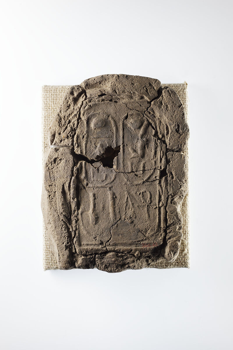 This fragmentary mud brick is stamped with a seal that combines the throne names of Hatshepsut (right) and of her father Thutmose I (left). Each royal name is written in a cartouche and followed by an epithet. The inscription reads (right to left) Maat-ka-re, given life; Aa-Kheper-ka-re, justified (true of voice). These epithets indicate that Hatshepsut lives and that her father is deceased. The two rulers are symbolically united by having their names and epithets enclosed in a large cartouche. The same seal impression was used to stamp another brick in the collection (90.6.42)