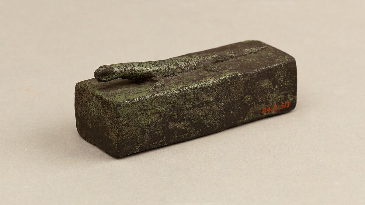 The lizard in later periods of Egyptian history was linked with the creator and solar god Atum, in large part because of their reptilian tendency to warm themselves in the sunshine. Almost all copper alloy representations, like this one, show the lizards prone, with legs slightly splayed, as if basking in the sun’s rays. Most rest on top of boxes that would have held mummified lizards. On this example, the box is open at the back for the insertion of one or more mummies. These boxes would have been offered in temples or for deposition in animal necropoleis, not just in honor of Atum, but also in broad connection with other animal representations linked to solar cult, such as shrew mice, ichneumons, or falcons.