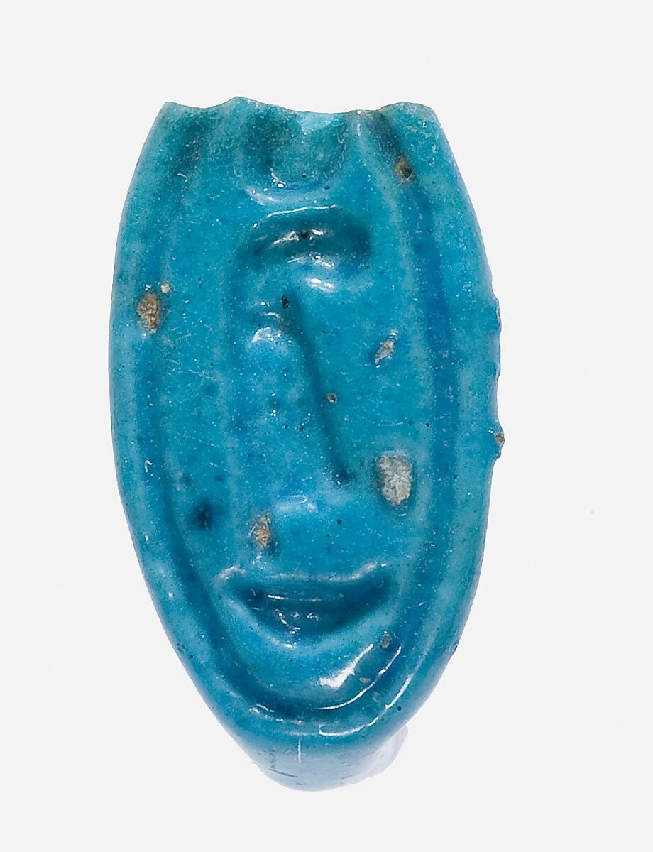 On this ring, the writing of Amenhotep III's throne name, Nebmaatre, has been simplified by the substitution of the ostrich feather for the seated goddess (Maat). The more common spelling may be seen on another faience ring from Malqata.