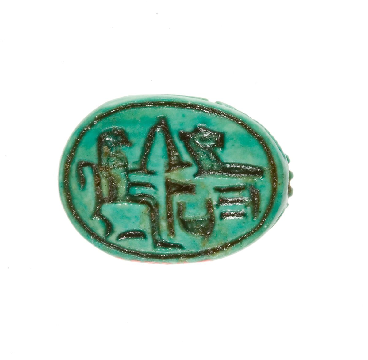 This scarab was found in a foundation deposit associated with Hatshepsut's funerary temple at Deir el-Bahri. The base is inscribed with her personal name, Hatshepsut ("foremost of noblewomen") linked with the title God's Wife. Hatshepsut inherited the title while she served as principal queen of her half-brother, Thutmose II. Later in her life, after taking on the titles of King, Hatshepsut passed the title to her daughter, Neferure (see scarab 27.3.326).
