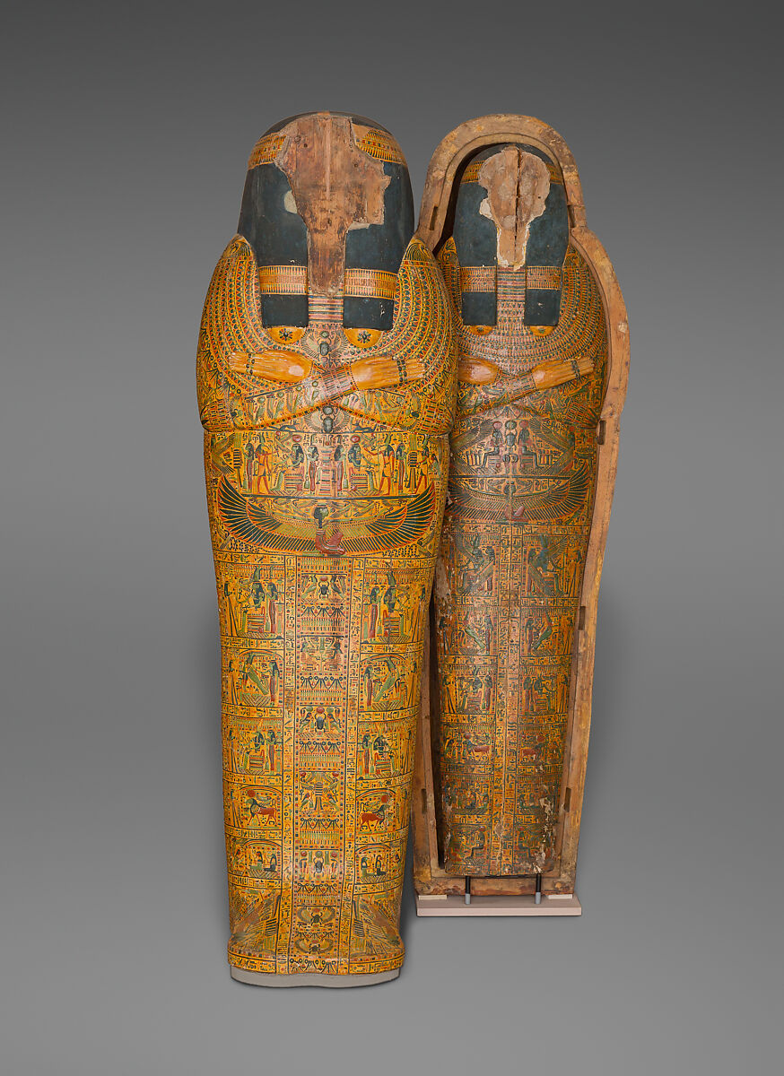 Nauny was buried in a nested pair of anthropoid (human-shaped) coffins. The set included what appears to be a third lid, but is actually a slightly curving cover often called a "mummy board." This was placed directly over the mummy. Nauny's mummy board has decoration similar to her coffin lids as was customary in Dynasty 21. For a different style of mummy board, see 86.1.5c.