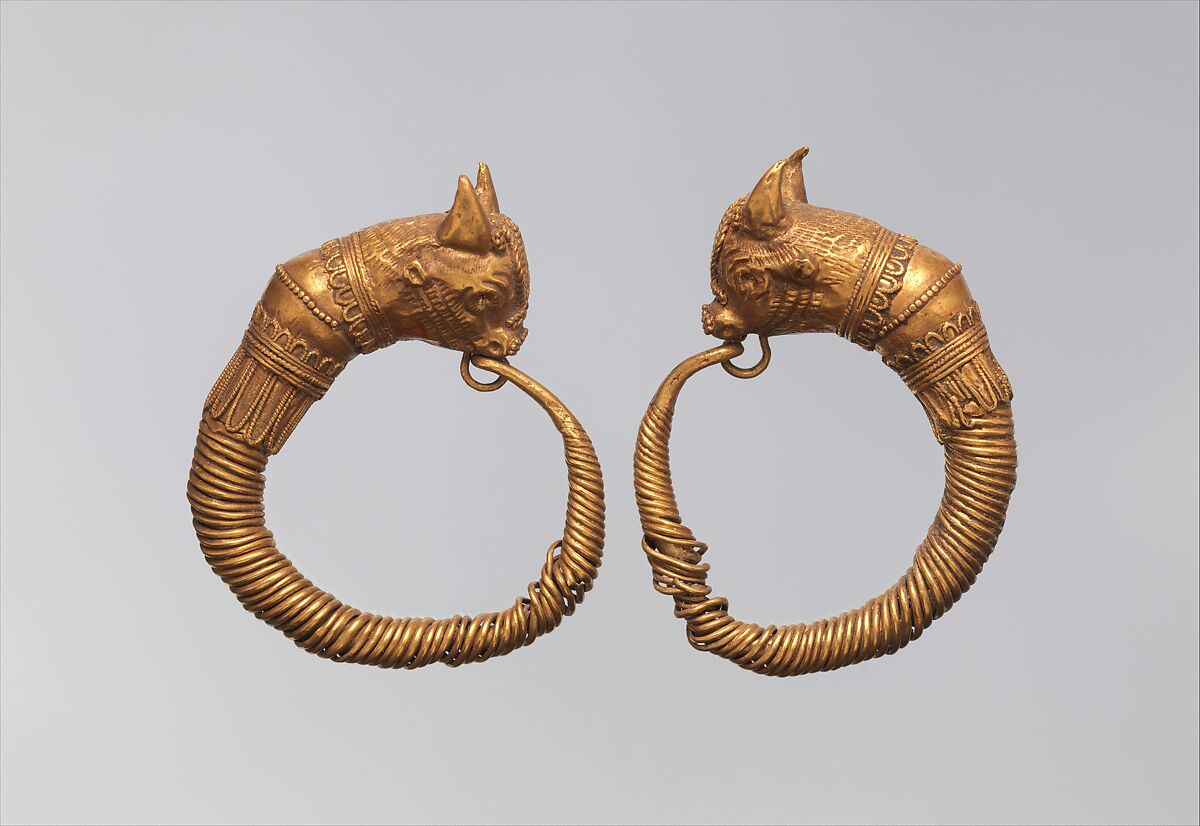 Hoops formed of wound wire with animal head terminals are the commonest type of Hellenistic earring. The bull-head earring appears throughout the Mediterranean, probably a positive image because of the physical and sexual prowess attributed to bulls.