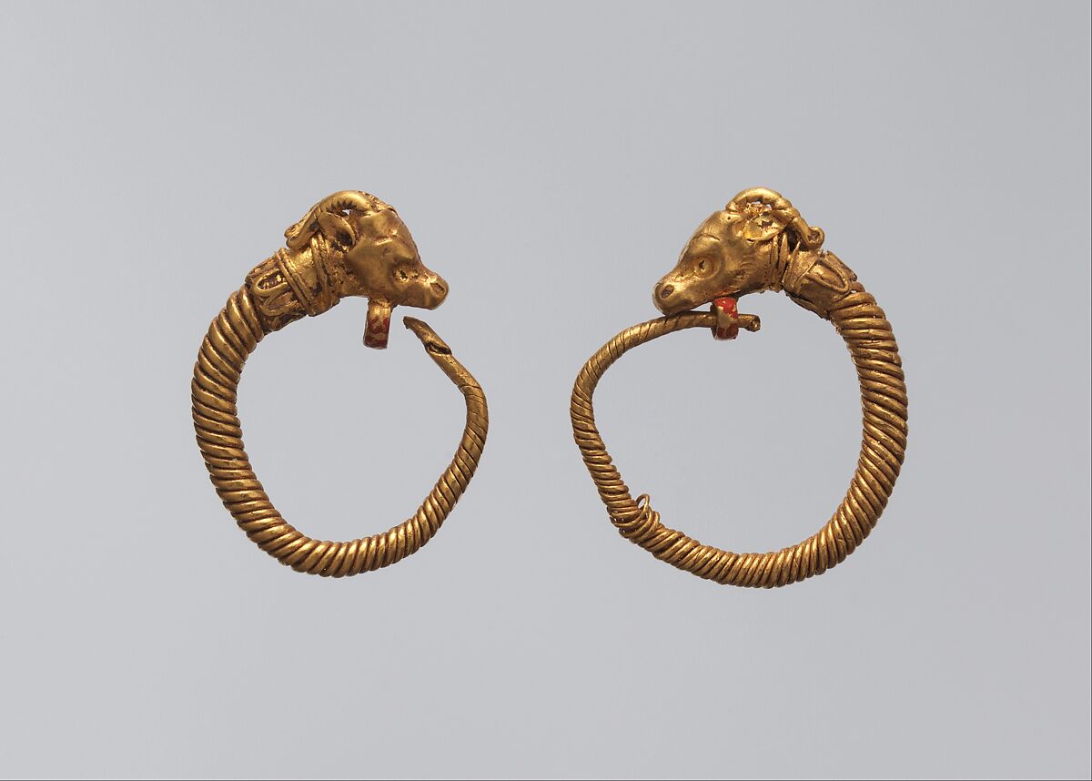 Hoops formed of wound wire with animal head terminals are the commonest type of Hellenistic earring. The heads on these earrings have been referred to as those of gazelles, but is now thought more likely to be an ibex. Ibex-head earrings are well-known in Egypt, but also Asia Minor and Cyprus.