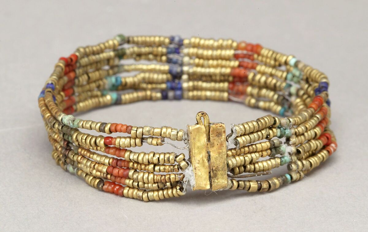 - Medium: Gold, carnelian, lapis lazuli, blue and green glass, faience on bronze or copper wire