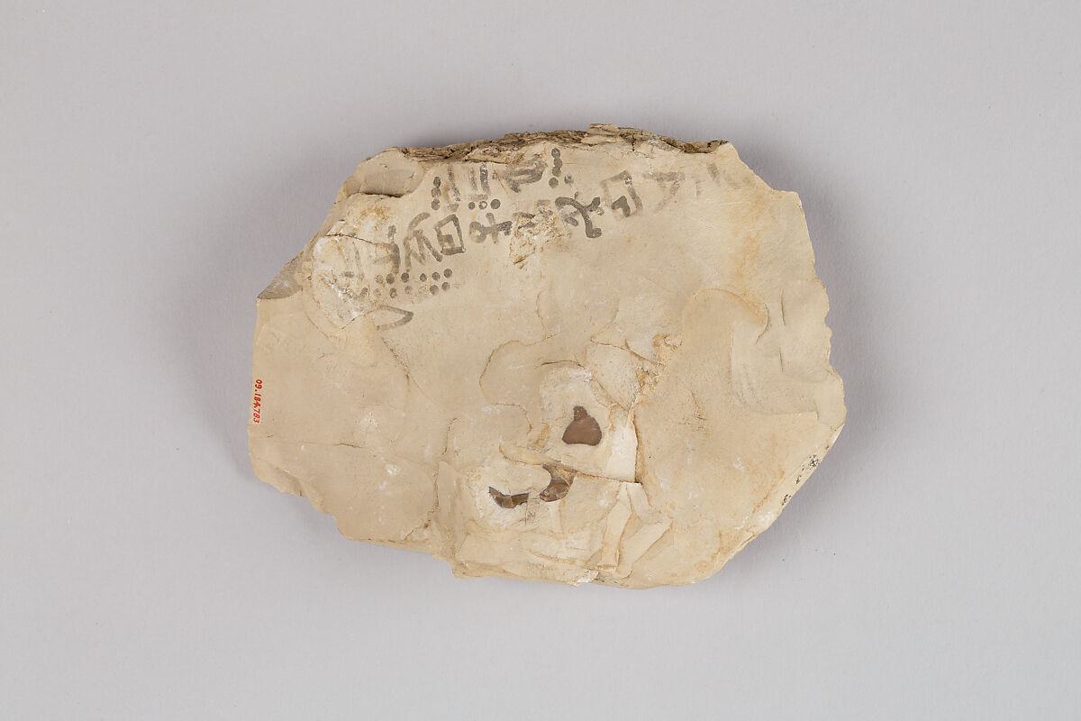 Ostraca (plural for ostracon) are potsherds used as surfaces on which to write or draw. The term is used, by extension, to refer to chips of limestone, which were employed for similar purposes. Despite their humble appearances, ostraca bear a wide range of images and texts, including administrative documents, literary texts, and depictions of royal and divine figures. The texts were mostly written with reed pen and ink of two colors, red and black, and inscribed in Hieratic, the cursive script of ancient Egypt throughout most of its periods. This ostracon bears identity markers referring to royal necropolis workmen.
