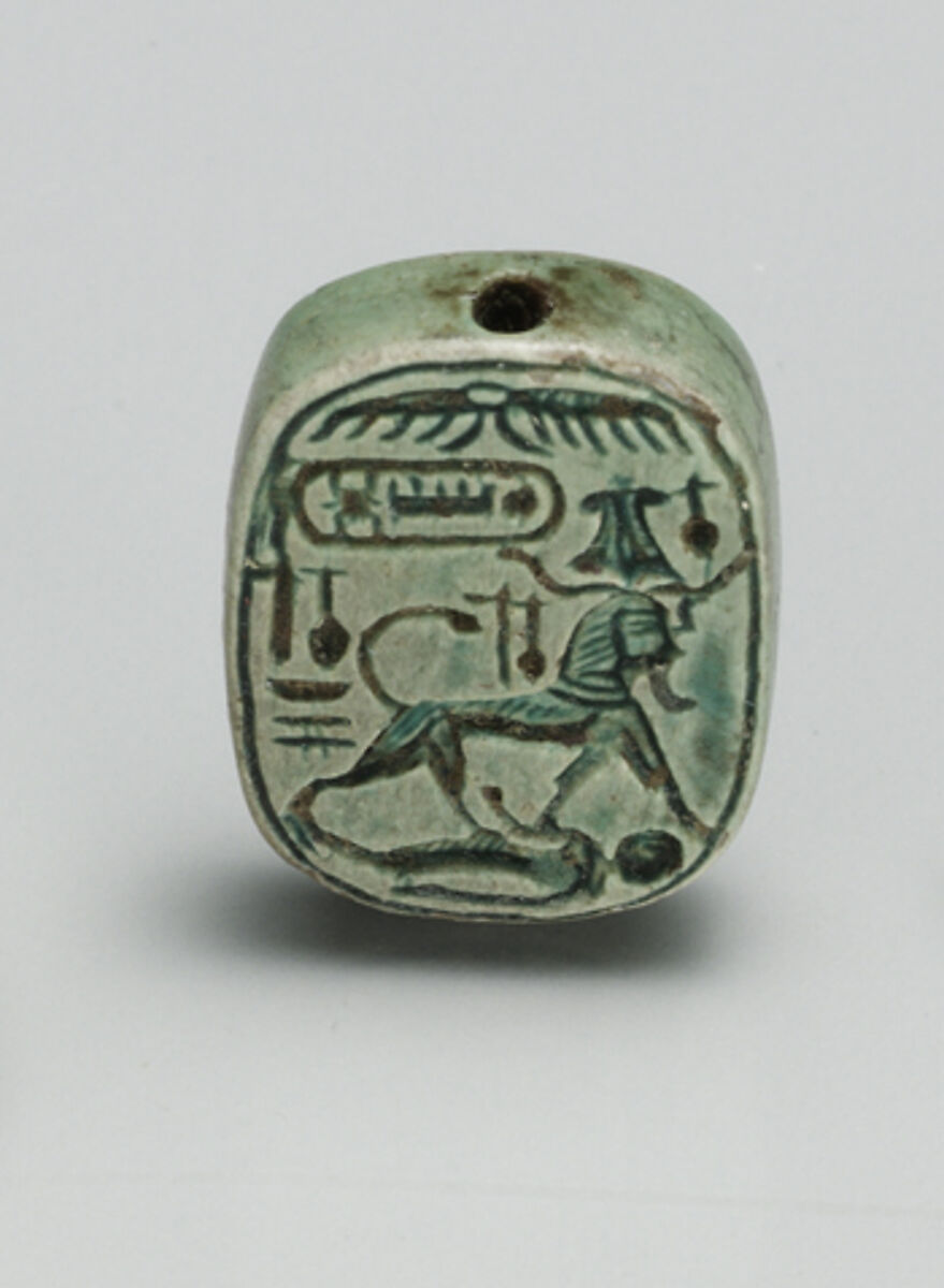 On one side of this plaque Thutmose III seen enthroned beneath a winged disk. On the other he is depicted as a sphinx striding over a captive.