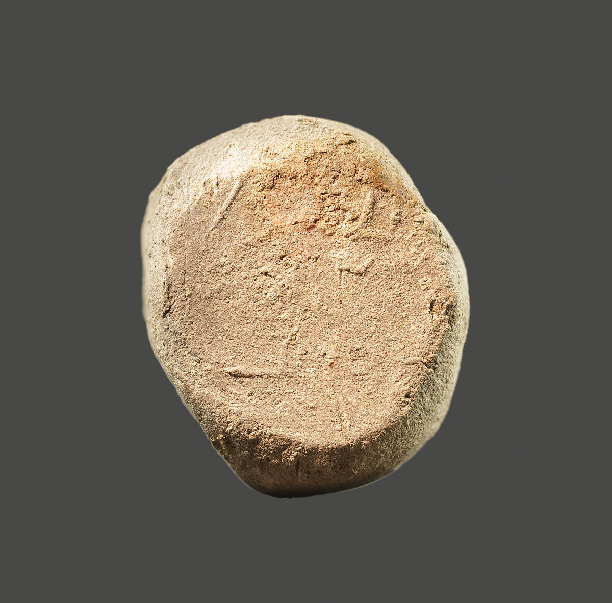 Small lumps of clay were often used to seal goods or documents. They are called sealings. On one side they often bear an impression of the seal used, while another side can show an impression of the object itself or of its closing mechanism (such as a string). This lump of clay bears a seal impression, but its conical shape suggests that it was never attached to an object. It can therefore be identified as a reference sealing, which was used to verify the authenticity of sealings that were attached to documents or goods. Or it could have been used as proof of authorization for certain dealings. Three more reference seals were found in the same tomb, but in a different part of it (25.3.267a-c). The reference sealing here shows an impression from the same seal as 25.3.267b that reads "Storehouse of Hathor."