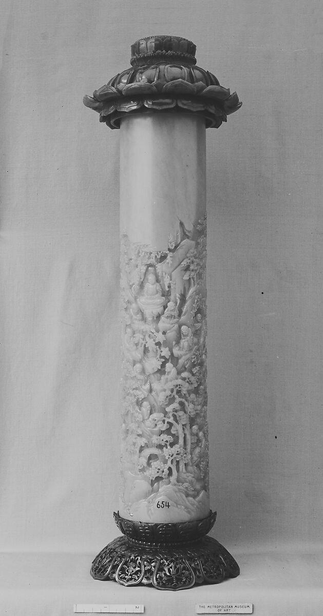 The column depicts Buddha and his disciples in a mountain landscape. Jade, the material used here, is a hard mineral that is difficult to carve; this piece’s intricate detail and lustrous finish demonstrate the great skill and patience of the Chinese craftsmen who created it.