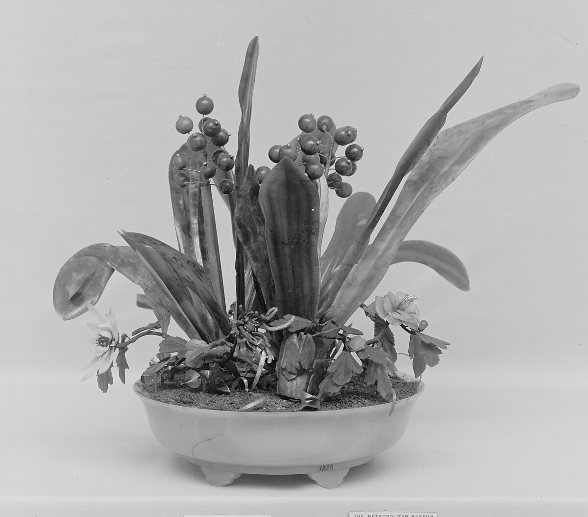 - Medium: Nephrite; greenish-white jade (dish); mottled green nephrite with coral red berries (plants)