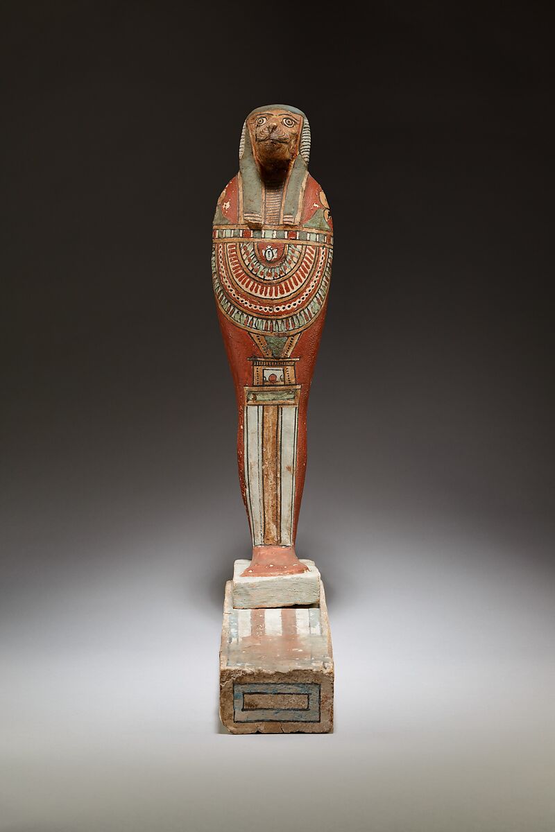 This baboon-headed figure represents the god Hapy, who protected the lungs. He is one of the four so-called sons of Horus that are often depicted as mummies, each with a different head (for the other three statuettes belonging to the same set, see 12.182.37a-c). The sons of Horus were deities who protected the internal organs and are probably best known from their representations on the lids of the canopic jars that contained mummified viscera. They were also thought to assist in the process of mummification and to provide nourishment, possibly because they were associated with the internal organs. Thus they had a general protective function for the deceased.