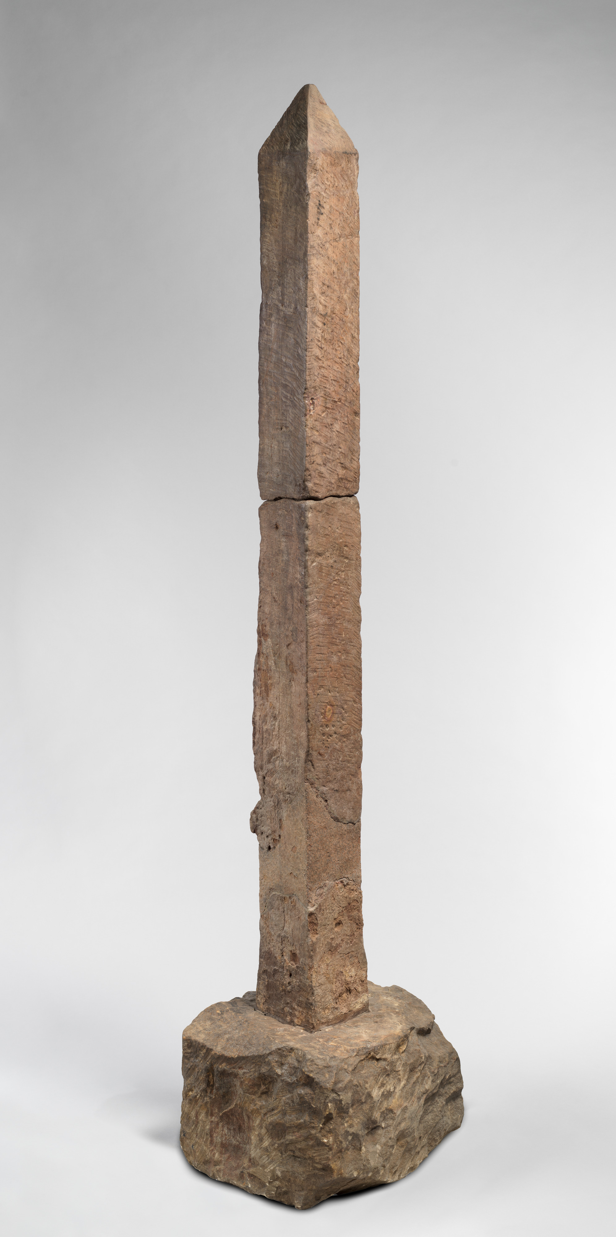 Carved more than two thousand years after the earliest known obelisks, this is one of four examples erected in the tomb of the sacred rams at Elephantine, the southern border of Egypt proper. The deliberately roughened surfaces indicate that texts were once inscribed on layers of stucco that have now fallen away, so we do not know the exact form of their dedications. However, we do know that the rams buried here were considered incarnations of the creator god Khnum, patron of the First Cataract region and a divinity closely associated with the sun god Re.