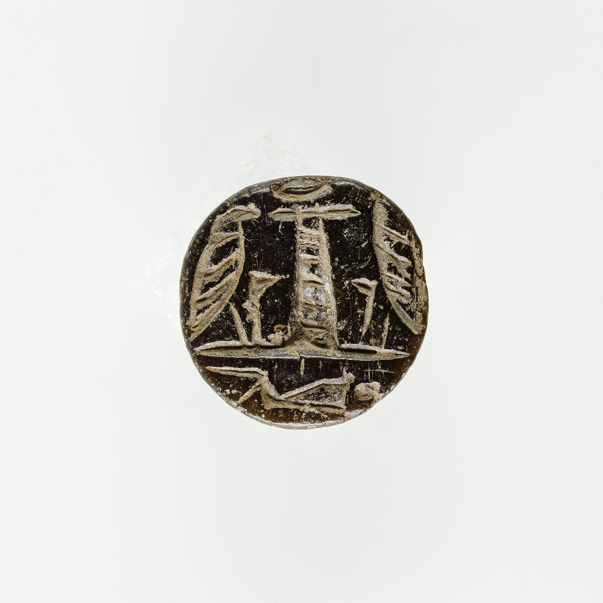 The underside of this round button-shaped seal-amulet is decorated with a stylized djed pillar (the symbol of stability associated with Osiris) flanked by lotuses and birds. Below the djed pillar lies a prone male figure. The back has a broken loop handle.