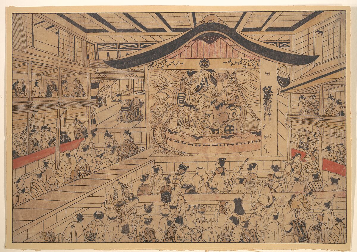 While showing the print artist Masanobu’s novel experimentation with Western perspective to capture the expansive view of a crowded Kabuki theater, a scene from a vendetta play based on the legend of the Soga brothers is shown on stage. In the New Year’s season of 1748, the celebrated actor Sanogawa Ichimatsu I (1722–1762) played the starring role of Soga no Gorō, on the left, and his loyal retainer Asaina is played by Ōtani Oniji I (1717–1757).