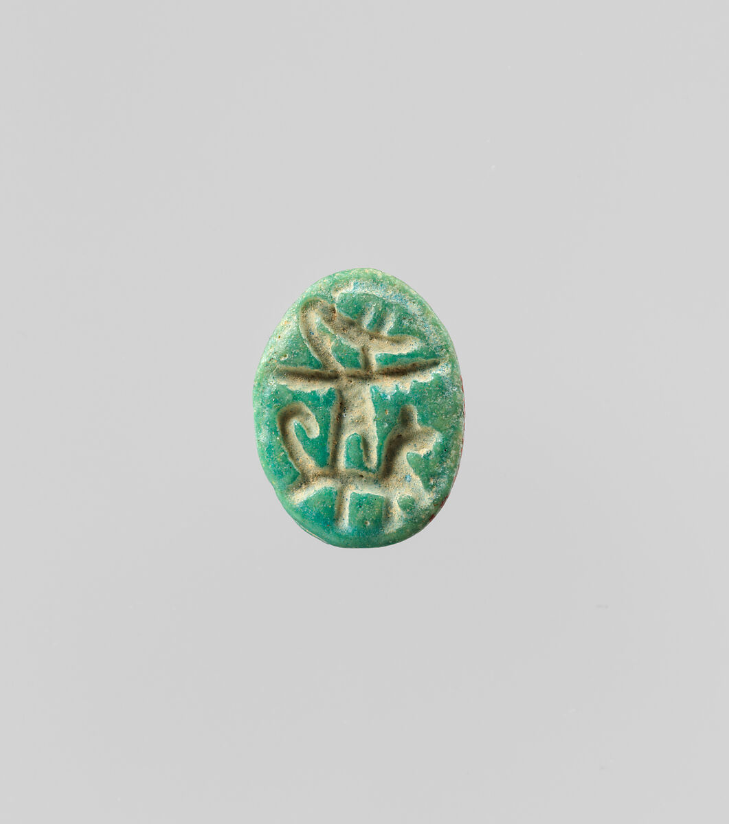 Seth-Baal is a winged deity that appears on scarabs in the late New Kingdom (ca. 1295–1070 B.C.). When the Near Eastern storm god Baal was introduced in Egypt at the end of the Middle Kingdom, he was identified with the Egyptian god of chaos (and bad weather), Seth. On this scarab, Seth-Baal spreads both his wings wide open. He wears a horned conical headdress with long streamer at the back, and he displays a very prominent pointed beard. The deity stands on the back of a lion, which is uncommon for Egyptian deities but is often the case for depictions of Near Eastern gods and goddesses.