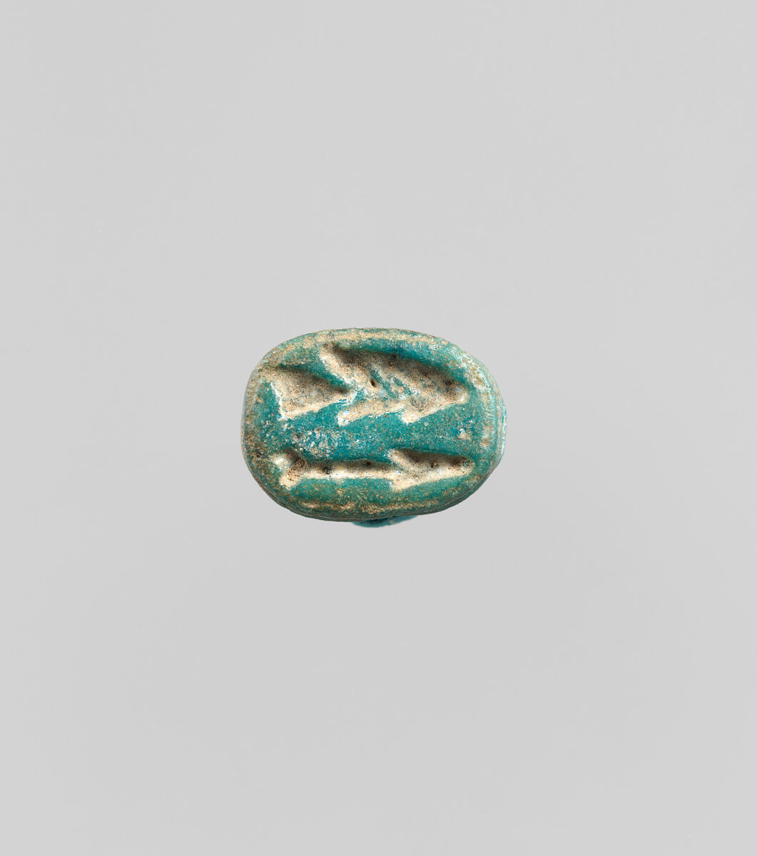 Although the ancient Egyptians paid attention to detail when depicting fish on the walls of tombs and temples, it is not always possible to identify the species incised on seal-amulets. The fish is a popular theme on New Kingdom scarabs, especially during Dynasty 18 (ca. 1550–1295 B.C.). It is often assumed that these represent the well-known Nile tilapia, the fish which was a symbol of fertility and rebirth. New Kingdom scarabs show the fish with lotus flowers or buds coming from its mouth, or paired with another sign or symbol. Here, it may be a harpoon or fishing spear.
