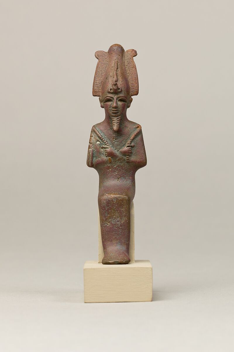 Osiris, foremost of the Egyptian funerary gods and ruler of the underworld, is shown sitting and wearing a close-fitting enveloping garment. The garment hugs the contours of his arms and shoulders. His eyes are deep cut for the addition of gilding or inlay, and a suspension loop is positioned at the back of the neck. He holds the royal crook and flail with his arms crossed on his chest. Copper alloy statuettes of Osiris generally exhibit one of three arm positions: asymmetrical with the right fist over the left, symmetrical with the fists touching, and arms crossed. The latter position, seen here, is the least common of the three but still frequently utilized. Why these arm positions are so consistently represented and how they relate to workshop practices, chronological changes, or conceptions of cult is unknown.