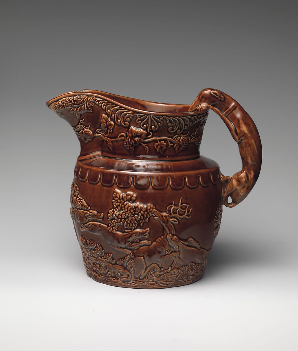 This pitcher is decorated with a hunting scene in relief and is covered in a mottled brown and cream "Rockingham" glaze.