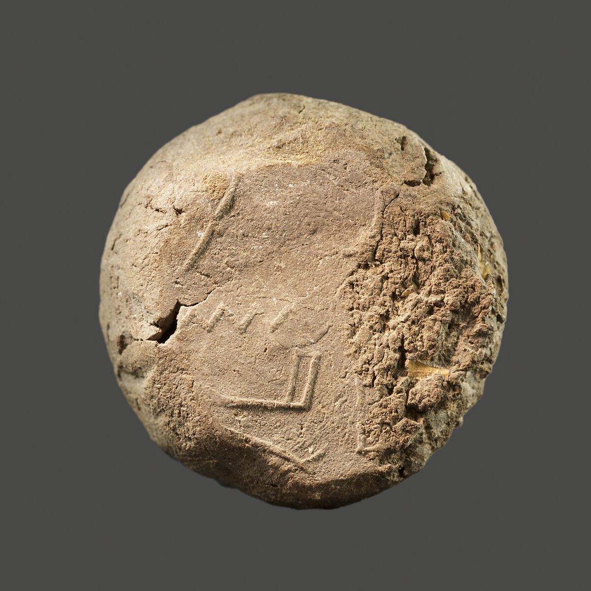 Small lumps of clay were often used to seal goods or documents. They are called sealings. On one side they often bear an impression of the seal used, while another side can show an impression of the object itself or of its closing mechanism (such as a string). This lump of clay bears a seal impression, but its conical shape suggests that it was never attached to an object. It can therefore be identified as a reference sealing, which was used to verify the authenticity of sealings that were attached to documents or goods. Or it could have been used as proof of authorization for certain dealings. This reference seal was found together with two others (25.3.267a, c) and a third one (26.3.282) was discovered in another area of the same tomb. The reference sealing here shows an impression from the same seal as 26.3.282 that reads "Storehouse of Hathor."