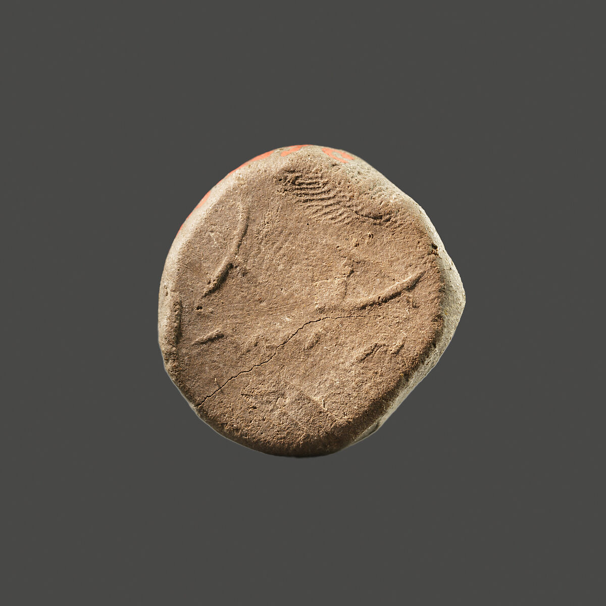 Small lumps of clay were often used to seal goods or documents. They are called sealings. On one side they often bear an impression of the seal used, while another side can show an impression of the object itself or of its closing mechanism (such as a string). This lump of clay bears a seal impression, but its conical shape suggests that it was never attached to an object. It can therefore be identified as a reference sealing, which was used to verify the authenticity of sealings that were attached to documents or goods. Or it could have been used as proof of authorization for certain dealings. This reference seal was found together with two others (25.3.267a, b) and a third one (26.3.282) was discovered in another area of the same tomb. The reference sealing here shows an impression from the same seal as 25.3.267a that reads "Storehouse of the Great (Goddess)."