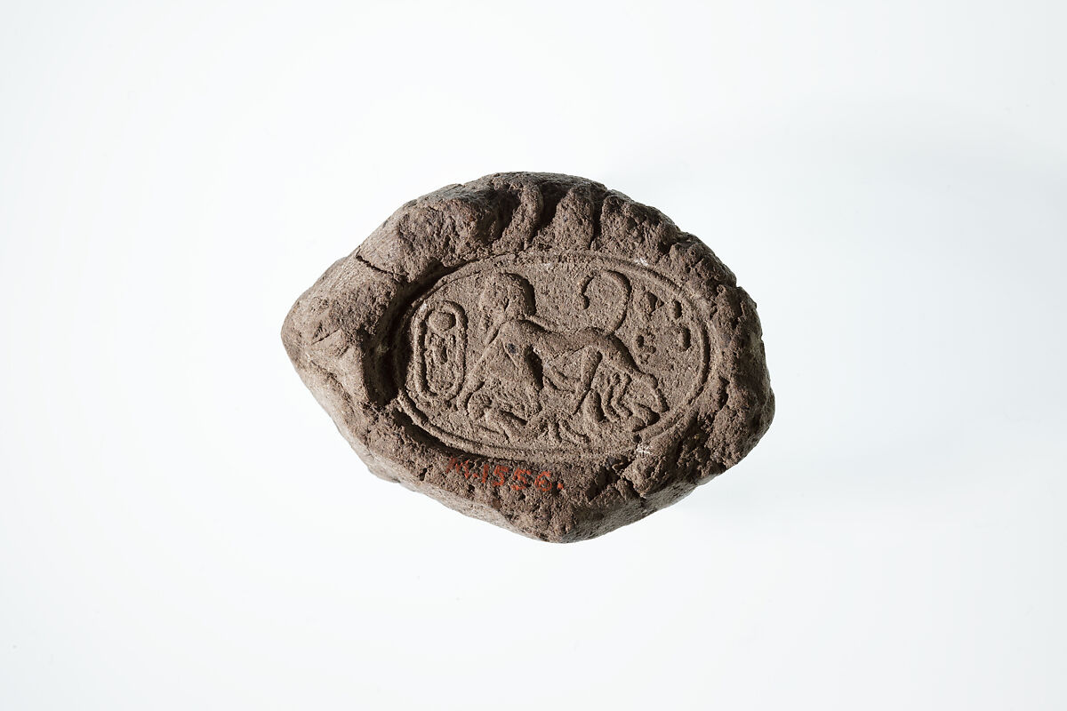 This clay sealing preserves a seal impression about the size of a ring that may have served as an official seal. The impression has the trone name of Tutankhamun, Nebkheperure, in the cartouche at the left. The king is represented as a sphinx trampelling an enemy.