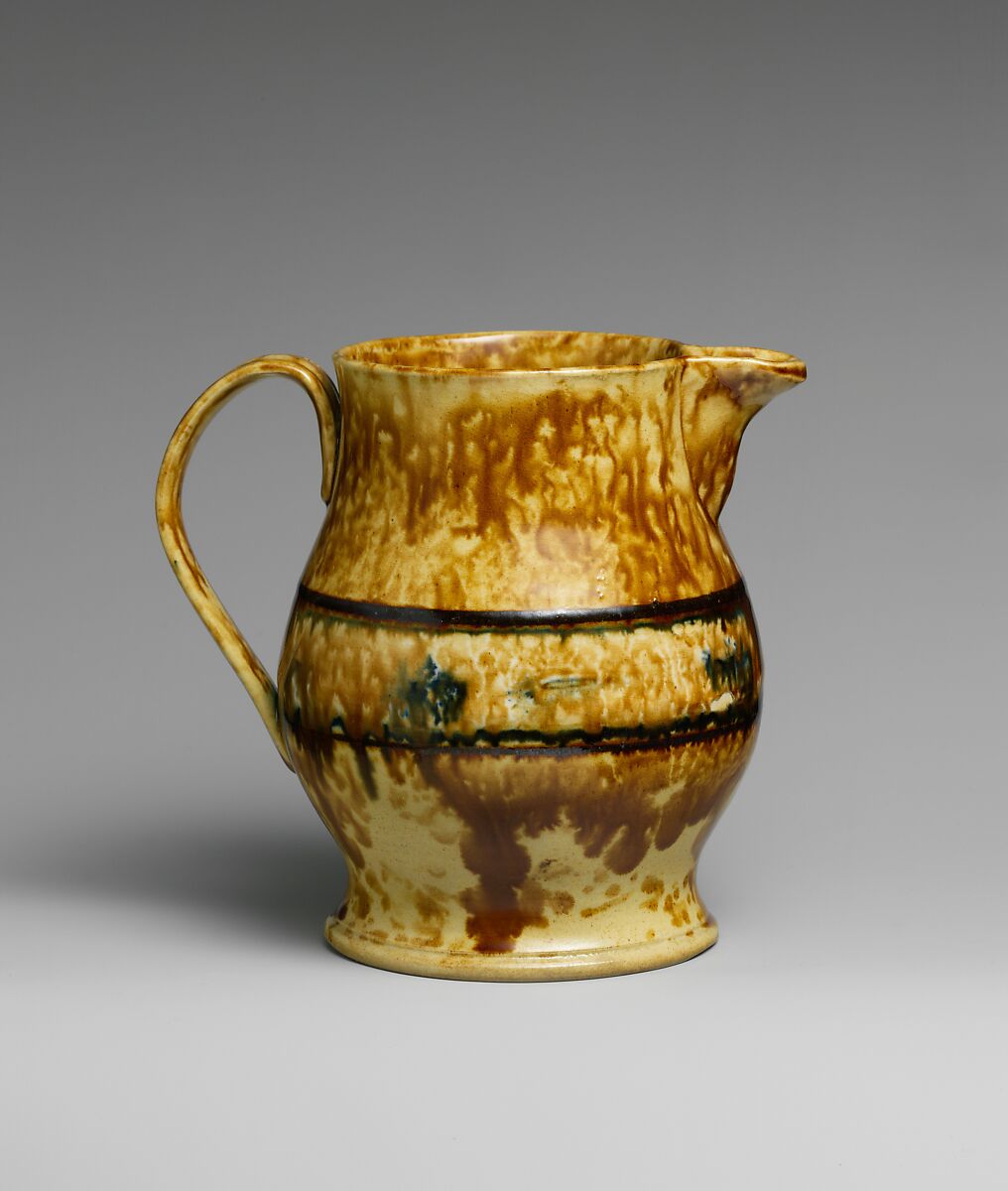 This earthenware pitcher is covered in a mottled yellow and brown "Rockingham" glaze.