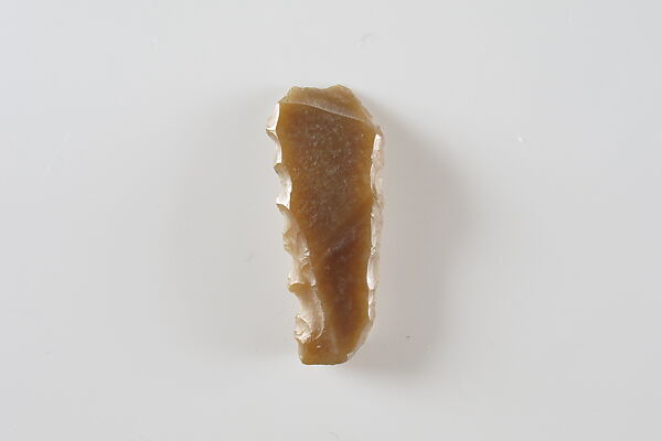 This small piece of flint was a key element to a successful agricultural season in ancient Egypt. Grain was a staple of the economy, as bread and beer made from grain were consumed daily. They also formed the foundation of eternal sustenance, as funerary offerings. Ancient Egyptians used sickles made from flint and wood to reap grain. Pieces of flint such as this one were shaped to fit into a wooden haft along with a number of other such inserts, and secured with an adhesive. The flint pieces provided a sharp edge to cut the grain stalks. With use, the flint would wear down and develop a shiny gloss. The flint inserts could be re-sharpened or replaced as needed. Flint, rather than copper alloy, was the primary material used to make sickles in Egypt until the first millennium B.C. when iron became more widely available. The reason for using flint was probably multifaceted and included considerations such as its abundance, its ease of manufacture compared to casting metal tools, flint’s proficiency at cutting grain, and the relationships between the people who made flint tools and the people who used them.