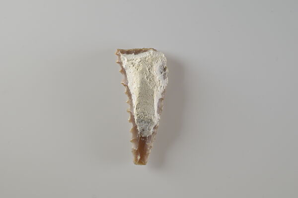 This small piece of flint was a key element to a successful agricultural season in ancient Egypt. Grain was a staple of the economy, as bread and beer made from grain were consumed daily. They also formed the foundation of eternal sustenance, as funerary offerings. Ancient Egyptians used sickles made from flint and wood to reap grain. Pieces of flint such as this one were shaped to fit into a wooden haft along with a number of other such inserts, and secured with an adhesive. The flint pieces provided a sharp edge to cut the grain stalks. With use, the flint would wear down and develop a shiny gloss. The flint inserts could be re-sharpened or replaced as needed.
