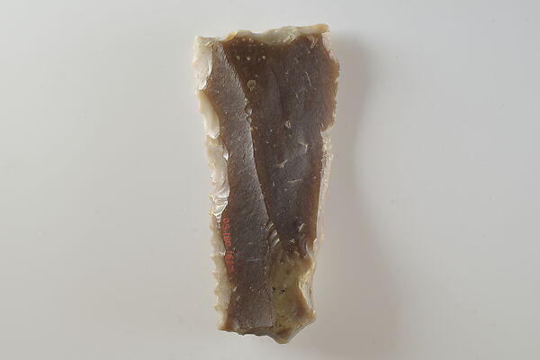 This small piece of flint was a key element to a successful agricultural season in ancient Egypt. Grain was a staple of the economy, as bread and beer made from grain were consumed daily. They also formed the foundation of eternal sustenance, as funerary offerings. Ancient Egyptians used sickles made from flint and wood to reap grain. Pieces of flint such as this one were shaped to fit into a wooden haft along with a number of other such inserts, and secured with an adhesive. The flint pieces provided a sharp edge to cut the grain stalks. With use, the flint would wear down and develop a shiny gloss. The flint inserts could be re-sharpened or replaced as needed. Flint, rather than copper alloy, was the primary material used to make sickles in Egypt until the first millennium B.C. when iron became more widely available. The reason for using flint was probably multifaceted and included considerations such as its abundance, its ease of manufacture compared to casting metal tools, flint’s proficiency at cutting grain, and the relationships between the people who made flint tools and the people who used them.