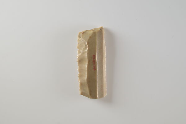 This small piece of flint was a key element to a successful agricultural season in ancient Egypt. Grain was a staple of the economy, as bread and beer made from grain were consumed daily. They also formed the foundation of eternal sustenance, as funerary offerings. Ancient Egyptians used sickles made from flint and wood to reap grain. Pieces of flint such as this one were shaped to fit into a wooden haft along with a number of other such inserts, and secured with an adhesive. The flint pieces provided a sharp edge to cut the grain stalks. With use, the flint would wear down and develop a shiny gloss. The flint inserts could be re-sharpened or replaced as needed. Flint, rather than copper alloy, was the primary material used to make sickles in Egypt until the first millennium B.C. when iron became more widely available. The reason for using flint was probably multifaceted and included considerations such as its abundance, its ease of manufacture compared to casting metal tools, flint’s proficiency at cutting grain, and the relationships between the people who made flint tools and the people who used them.