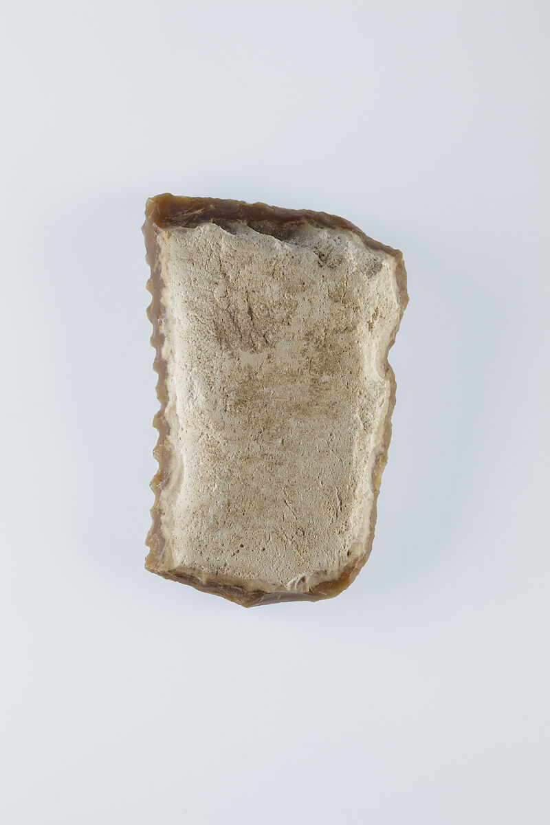 This small piece of flint was a key element to a successful agricultural season in ancient Egypt. Grain was a staple of the economy, as bread and beer made from grain were consumed daily. They also formed the foundation of eternal sustenance, as funerary offerings. Ancient Egyptians used sickles made from flint and wood to reap grain. Pieces of flint such as this one were shaped to fit into a wooden haft along with a number of other such inserts, and secured with an adhesive. The flint pieces provided a sharp edge to cut the grain stalks. With use, the flint would wear down and develop a shiny gloss. The flint inserts could be re-sharpened or replaced as needed.