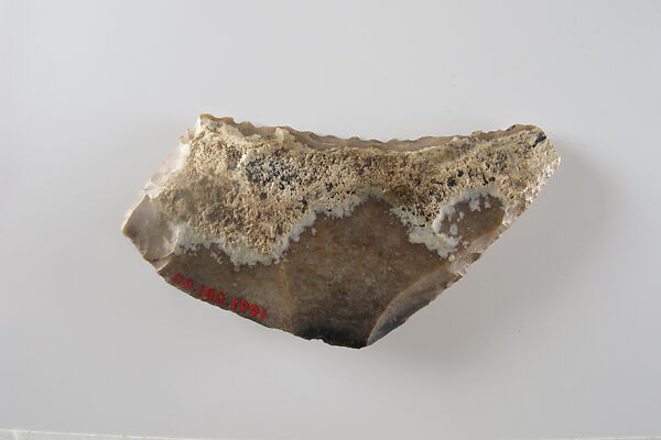This small piece of flint was a key element to a successful agricultural season in ancient Egypt. Grain was a staple of the economy, as bread and beer made from grain were consumed daily. They also formed the foundation of eternal sustenance, as funerary offerings. Ancient Egyptians used sickles made from flint and wood to reap grain. Pieces of flint such as this one were shaped to fit into a wooden haft along with a number of other such inserts, and secured with an adhesive. The flint pieces provided a sharp edge to cut the grain stalks. With use, the flint would wear down and develop a shiny gloss. The flint inserts could be re-sharpened or replaced as needed.