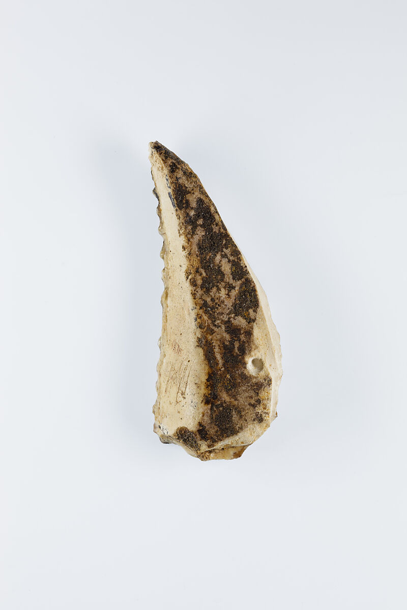 This small piece of flint was a key element to a successful agricultural season in ancient Egypt. Grain was a staple of the economy, as bread and beer made from grain were consumed daily. They also formed the foundation of eternal sustenance, as funerary offerings. Ancient Egyptians used sickles made from flint and wood to reap grain. Pieces of flint such as this one were shaped to fit into a wooden haft along with a number of other such inserts, and secured with an adhesive. The flint pieces provided a sharp edge to cut the grain stalks. With use, the flint would wear down and develop a shiny gloss. The flint inserts could be re-sharpened or replaced as needed.