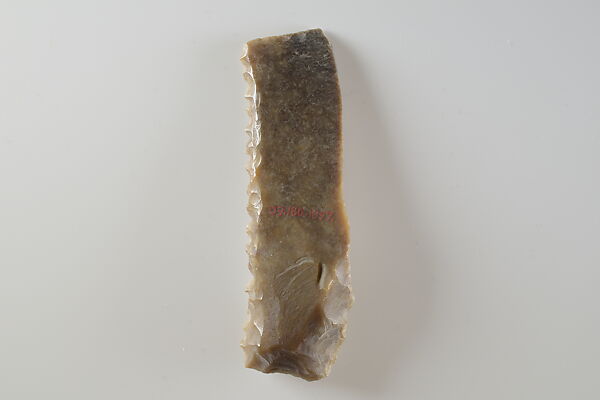 This small piece of flint was a key element to a successful agricultural season in ancient Egypt. Grain was a staple of the economy, as bread and beer made from grain were consumed daily. They also formed the foundation of eternal sustenance, as funerary offerings. Ancient Egyptians used sickles made from flint and wood to reap grain. Pieces of flint such as this one were shaped to fit into a wooden haft along with a number of other such inserts, and secured with an adhesive. The flint pieces provided a sharp edge to cut the grain stalks. With use, the flint would wear down and develop a shiny gloss. The flint inserts could be re-sharpened or replaced as needed.