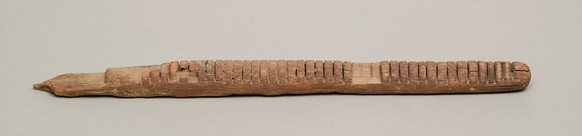 One side of this wooden object has slits at regular intervals. This allows to identify the tool as a warp spacer, which was part of a vertical loom. It used to evenly spread the warps when weaving linen textiles.