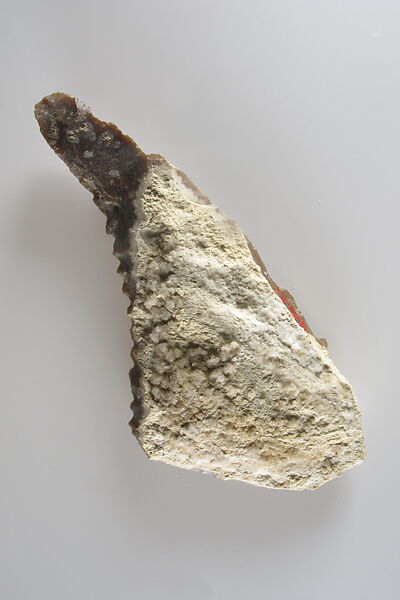 This small piece of flint was a key element to a successful agricultural season in ancient Egypt. Grain was a staple of the economy, as bread and beer made from grain were consumed daily. They also formed the foundation of eternal sustenance, as funerary offerings. Ancient Egyptians used sickles made from flint and wood to reap grain. Pieces of flint such as this one were shaped to fit into a wooden haft along with a number of other such inserts, and secured with an adhesive. The flint pieces provided a sharp edge to cut the grain stalks. With use, the flint would wear down and develop a shiny gloss. The flint inserts could be re-sharpened or replaced as needed.