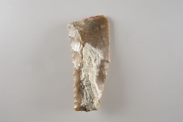 This small piece of flint was a key element to a successful agricultural season in ancient Egypt. Grain was a staple of the economy, as bread and beer made from grain were consumed daily. They also formed the foundation of eternal sustenance, as funerary offerings. Ancient Egyptians used sickles made from flint and wood to reap grain. Pieces of flint such as this one were shaped to fit into a wooden haft along with a number of other such inserts, and secured with an adhesive. The flint pieces provided a sharp edge to cut the grain stalks. With use, the flint would wear down and develop a shiny gloss. The flint inserts could be re-sharpened or replaced as needed.