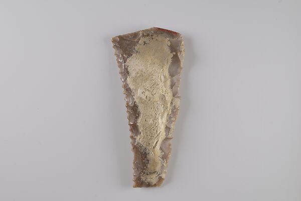 This small piece of flint was a key element to a successful agricultural season in ancient Egypt. Grain was a staple of the economy, as bread and beer made from grain were consumed daily. They also formed the foundation of eternal sustenance, as funerary offerings. Ancient Egyptians used sickles made from flint and wood to reap grain. Pieces of flint such as this one were shaped to fit into a wooden haft along with a number of other such inserts, and secured with an adhesive. The flint pieces provided a sharp edge to cut the grain stalks. With use, the flint would wear down and develop a shiny gloss. The flint inserts could be re-sharpened or replaced as needed.