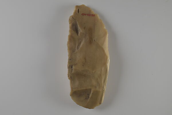 Known as a core tablet, this piece is the result of a specific step in a production process aimed at making long narrow blades. First, a thin tabular nodule of raw material was selected, as can be determined from the presence of cortex (the exterior surface of the original stone) on the sides of this piece. Next, flakes were removed from two edges of the tabular raw material fragment, as can be seen in the pattern of flaking scars on this piece. Then this core tablet was removed longitudinally from the tabular raw material fragment, leaving a long flat striking platform surface for blade removals.