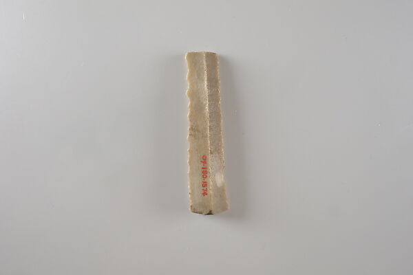 This small piece of flint was a key element to a successful agricultural season in ancient Egypt. Grain was a staple of the economy, as bread and beer made from grain were consumed daily. They also formed the foundation of eternal sustenance, as funerary offerings. Ancient Egyptians used sickles made from flint and wood to reap grain. Pieces of flint such as this one were shaped to fit into a wooden haft along with a number of other such inserts, and secured with an adhesive. The flint pieces provided a sharp edge to cut the grain stalks. With use, the flint would wear down and develop a shiny gloss. The flint inserts could be re-sharpened or replaced as needed. Flint, rather than copper alloy, was the primary material used to make sickles in Egypt until the first millennium B.C. when iron became more widely available. The reason for using flint was probably multifaceted and included considerations such as its abundance, its ease of manufacture compared to casting metal tools, flint’s proficiency at cutting grain, and the relationships between the people who made flint tools and the people who used them.