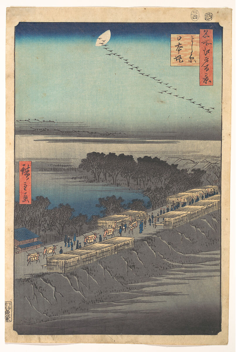 - Title: “Nihon Embankment at Yoshiwara,” from the series One Hundred Famous Views of Edo (Meisho Edo hyakkei, Yoshiwara, Nihonzutsumi)