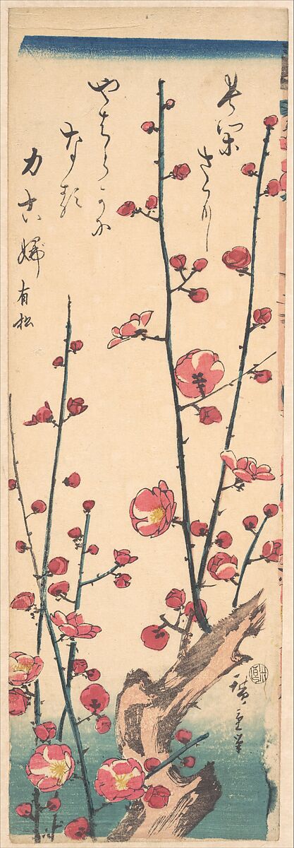 Branches of budding red and white plum blossoms sprouting from an aged, gnarled trunk remind us that appearances can be deceptive, and that old can give birth to new. The seventeen-syllable haikai—inscribed in cursive columns of calligraphy that echo the shapes of the branches—reads: